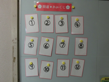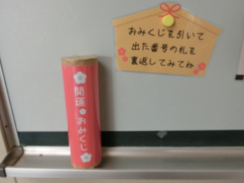 図書コーナーと保健コーナーの掲示です。図書コーナーには、本の福袋が並べられていました。福袋にチャレンジして、読書の幅を広げるきっかけになると良いですね。保健コーナーには、開運おみくじが並んでいました。運試しに引いてみると、明るい気持ちになりました。今年も良い年になりそうです。
