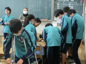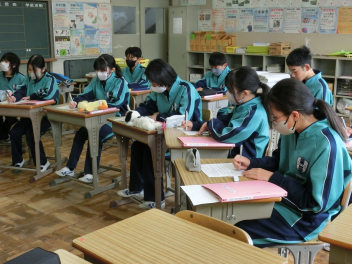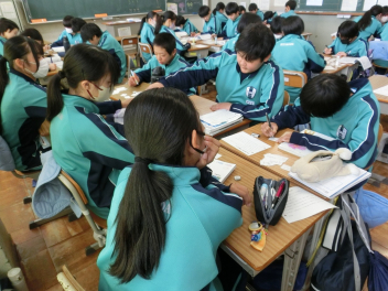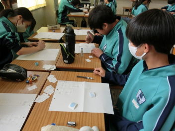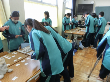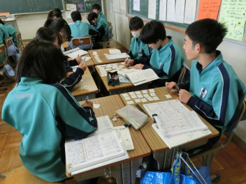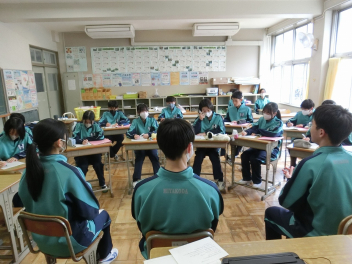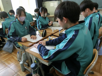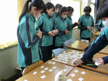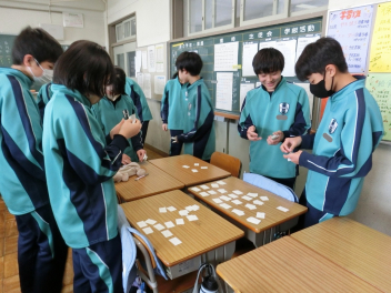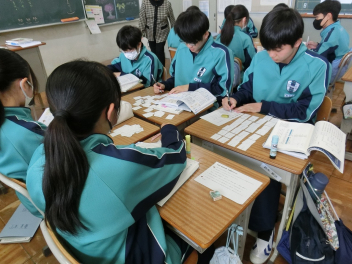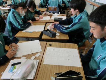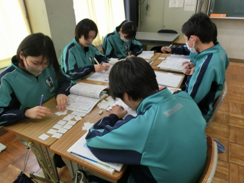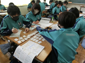 •  3月6日(金)の81期生の国語の授業の様子です。品詞の学習をお店屋さん形式で行っていました。最初にそれぞれのお店で決まった品詞(名詞、動詞など)をカードに書いて並べます。次にお店をまわり、気に入ったカードを集めます。そして、集めたカードを並べ、付属語を書き加えて文にします。最後は作品の交流をして、楽しみながら品詞について学ぶことができました。