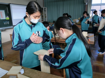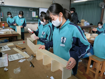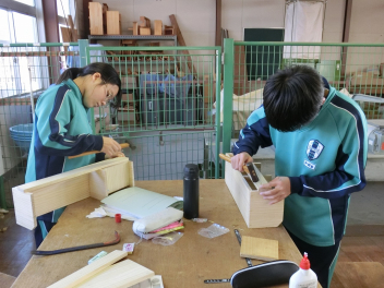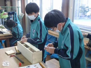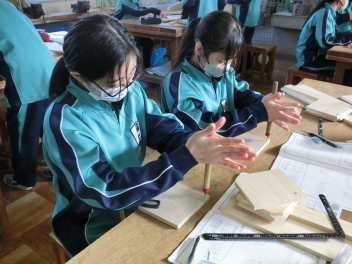 •  81期生の技術科の授業の様子です。いよいよ本立てが完成に近づいているようです。生徒はものづくりの楽しさと難しさを味わいながら作業に集中していました。「ものづくりは人づくり」と言われます。ものづくりを通して、思考力や創造力、課題解決能力やコミュニケーション力、指先の巧緻性やレジリエンスなど様々な力を身に付けていきます。