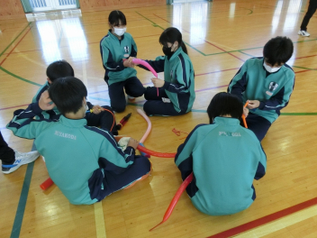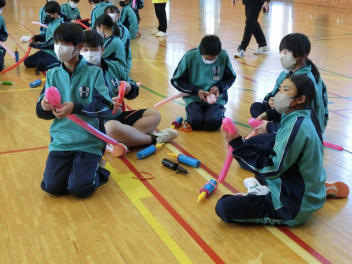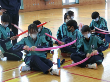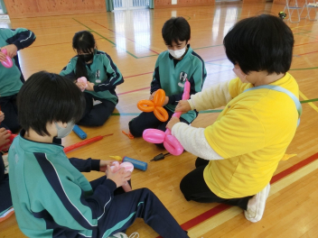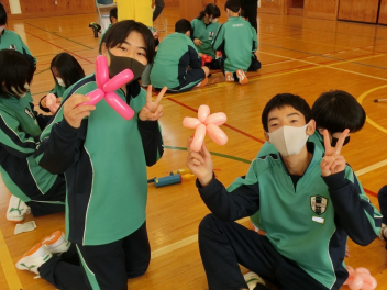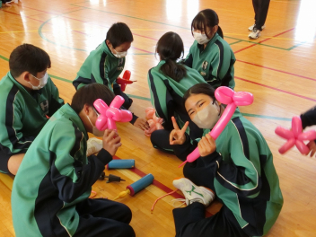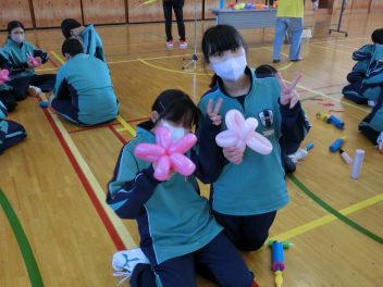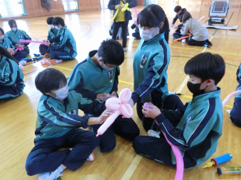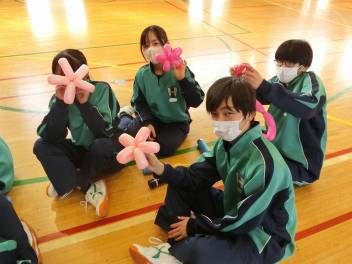 •  1月16日(金)に、第2回バルーンアート講座を開催しました。今回は剣をつくりました。バルーンをねじって持ち手をつくる過程で体育館には破裂音が何回も響きましたが、たくさんの完成度の高い剣が仕上がりました。次回は来週1月23日(金)です。1月25日(日)に行われる協働センターまつりには有志の代表生徒がバルーンアートコーナーのお手伝いをする予定です。