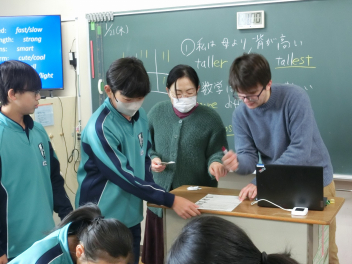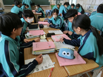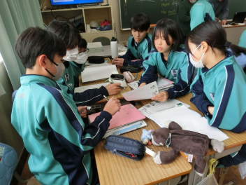 •  ALTのジャクソン先生が入っている英語の授業です。この日は、生徒の大好きなアニメのキャラクターを取り上げて学習していました。課題に対する答えをグループで話し合いながら正解を導き出しています。英語力とコミュニケーション力がアップします。