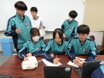 •  79期生の美術科の授業の様子です。生徒はそれぞれのデザインや図柄をアートナイフで切り取り、カラーフィルムを張り付けてステンドグラス風の作品に仕上げていました。物音ひとつない静寂の中で制作に集中し、感性や表現力が高まります。