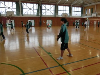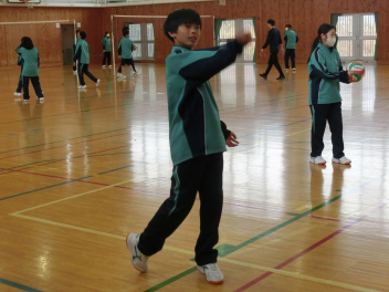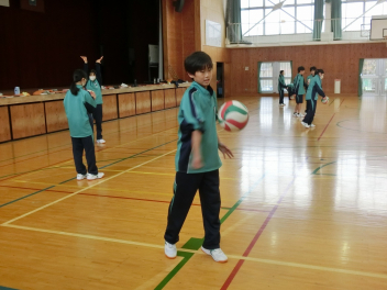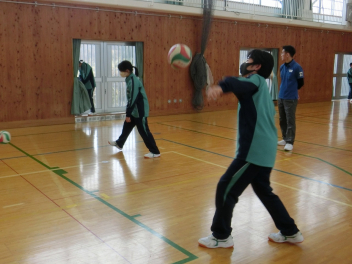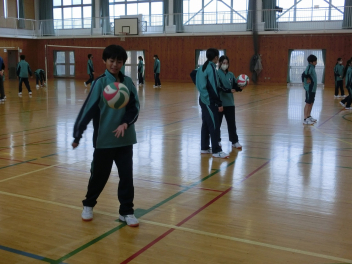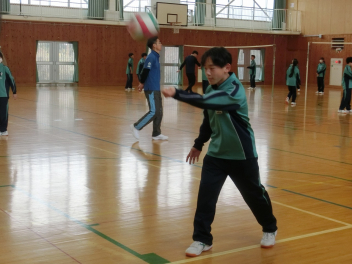 •  81期生の保健体育科のバレーボールの授業の様子です。グループでアンダーハンドサーブの練習をしていました。互いにアドバイスをしながらネットを越えるサーブが打てるように練習をしていました。