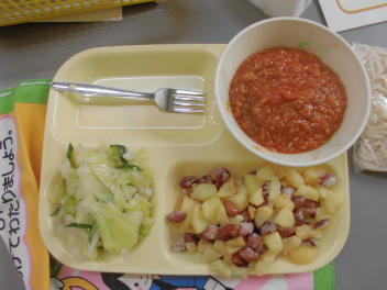 4月15日の給食は、ソフト麺とミートソースでした。教室からは、「おいしい。」「大好き。」という声が聞こえてきました。今年度も給食が始まって4日がたちましたが、子供たちは給食をもりもり食べて元気いっぱいに過ごしていました。