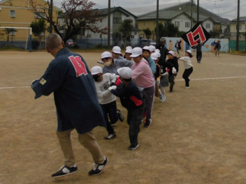 風は弱かったけれど、みんなで一生懸命走り、凧をあげることができました