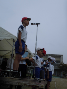 赤組、白組の応援団長が、校長先生の前で選手宣誓。