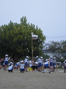 赤組と白組の間で、村櫛幼稚園の子たちも玉入れ。