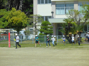 校庭では子供たちが、マラソンに取り組んでいて