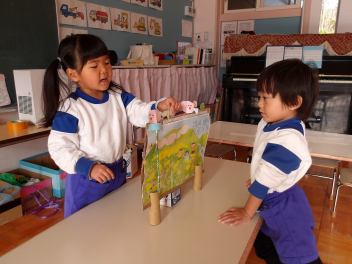 ペープサートで遊ぶ年少児。先生みたいですね。