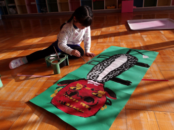 室内では、年長児が獅子舞の絵を描いています。迫力ある絵が描けました。
