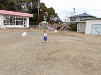 レジ袋を凧にして遊ぶ年少児。初めは、走って凧揚げしていました。