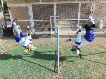 鉄棒だって、頑張ります。顔を見合って楽しそうです。