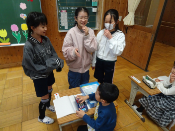 • 生活科の時間にまとめた「自分の成長絵本」を1年生に紹介しました。1年生は、赤ちゃんの頃の写真を見て、「かわいい。」と呟いていました。また、国語の時間に書いた2年生の思い出を発表しました。