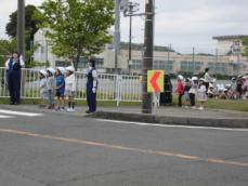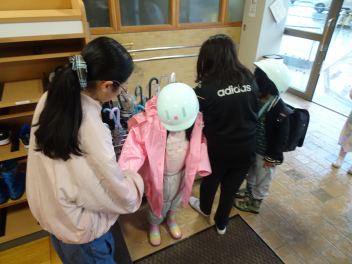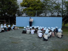 1~2年生の子供たちは、交通指導員さんからヘルメットのかぶり方から道路の歩き方、渡り方を教えてもらいました。