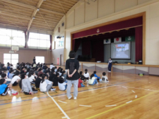 3~6年生の子供たちは、歩行時と自転車運転時では、止まろうと思ってから実際に止まるまでの距離が全然違うことを、実験を交えて教えてもらいました。また、映画を見ながら、具体的な場面での気を付けることやしてはいけないことを確認しました。