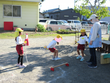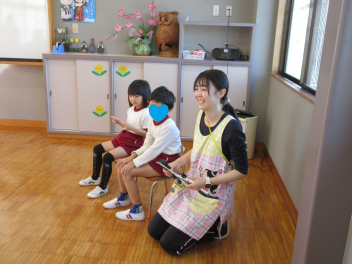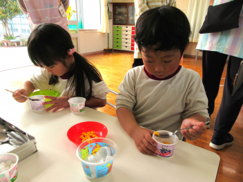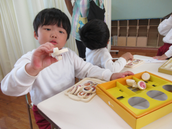 用具(スプーンやフォーク)の持ち方につながる遊びを経験できました