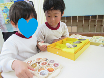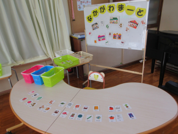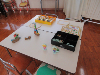 「たんぽぽ1」の保育室では、バランス積み木(動物・ドーナツ・アイス)やスプーンすくい、お店屋さんごっこ、紙コップタワーの遊びが楽しめるよ