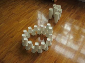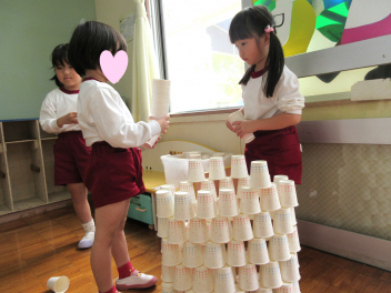 紙コップが崩れないように、慎重に慎重に…集中力が高まる遊びです