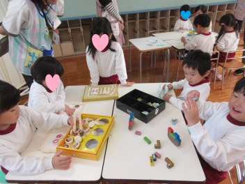 バランス積み木では、「用具ではさむ」「積み上げる」など指先を使った遊びが楽しめます