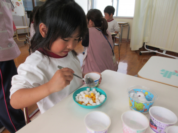 スプーンすくいでは、小さなヒヨコ豆や小さくきった消しゴムを一つずつ容器に移して遊びました