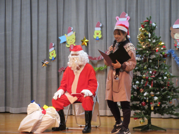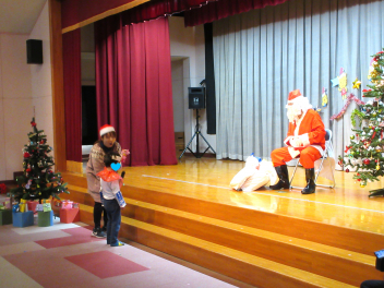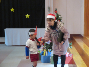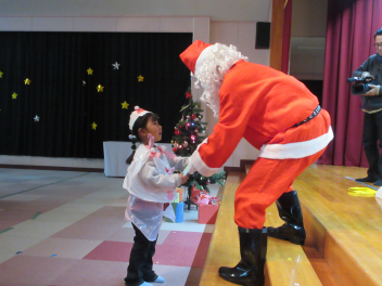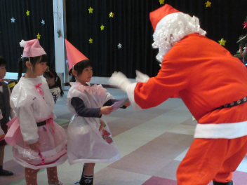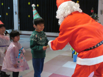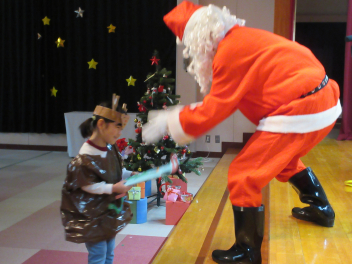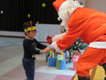 サンタ「みんな良い子(寒さに負けず元気に遊んでいる・苦手な野菜を頑張って食べている・駒や縄跳びに挑戦している)だからプレゼントを届けに来たのだよwink
