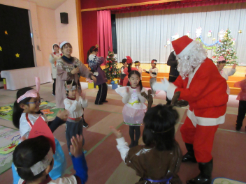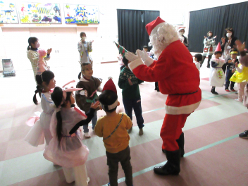 「メリークリスマス」とサンタさんが中川幼稚園に来てくれました