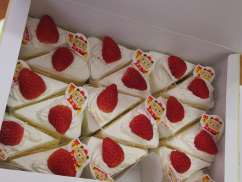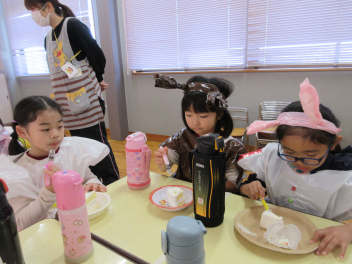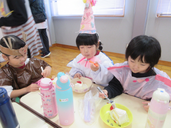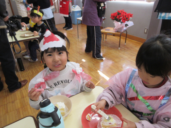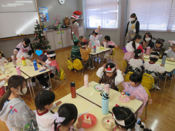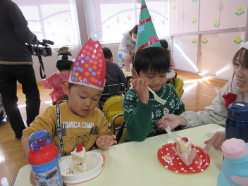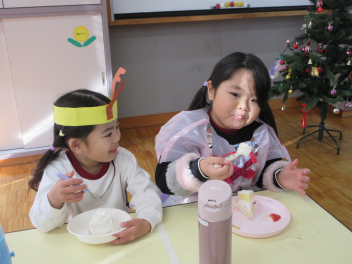 クリスマス会の後は、みんなでクリスマスパーティーのお楽しみですクリスマスケーキをなかよしグループのお友達と食べました