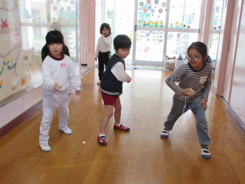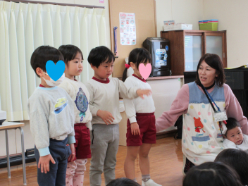 誕生会が終わった後、なかよしグループのお友達と輪になって「ジングルベル」を踊りました