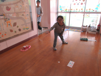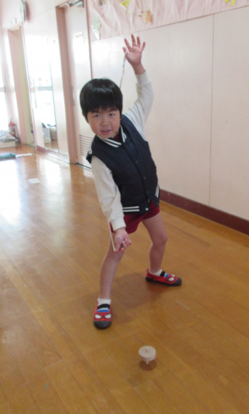 • 冬休みの間にコマの練習をたくさんしたうめ組のお友達がコマ回しを見せてくれましたfrown
