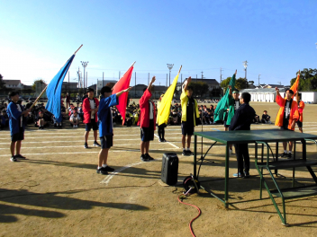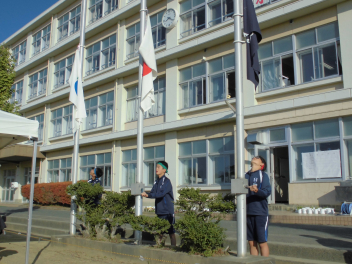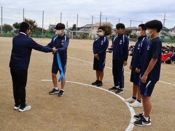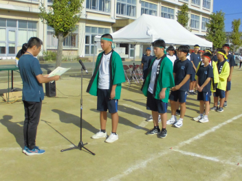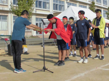 総練習に先立ち、校長先生から各団長へはちまきが授与されました。