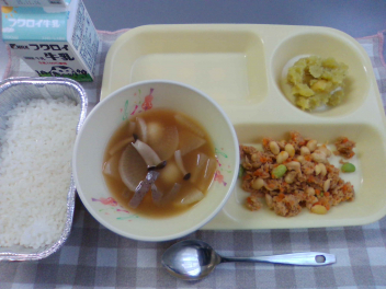 ごはん 牛乳 豆入りまぐろそぼろごはん 白玉団子汁 栗入りきんとん でした。