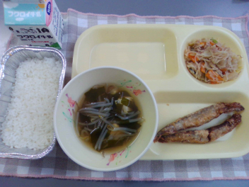 ごはん 牛乳 ししゃもの竜田揚げ 炒めビーフン わかめスープ でした。