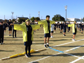 前半では、開会式・閉会式の流れを丁寧に確認し、ラジオ体操の練習を行いました。どの団も本番を意識して、動きや姿勢をそろえようと真剣に取り組んでいました。