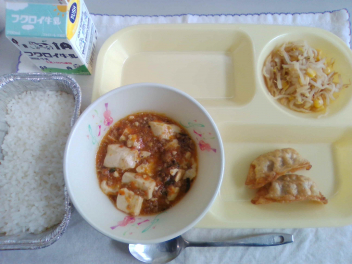 ごはん 牛乳 麻婆豆腐 揚げぎょうざ もやしの中華あえ でした。
