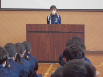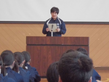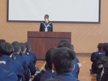 式では、各学年と大樹の代表である袴田さん、池谷さん、國井さん、大塩さんの4名が、2学期の振り返りや新年に向けての抱負を堂々と発表しました。全校生徒の思いが伝わるような、大変立派な内容でした。