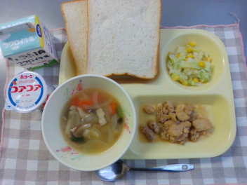 食パン 牛乳 チキンの照り煮 キャベツのサラダ アルファベットスープ ヨーグルト でした。