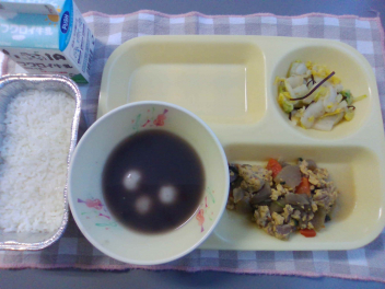 ごはん 牛乳 根菜の卵とじ 白菜の即席づけ おしるこ でした。