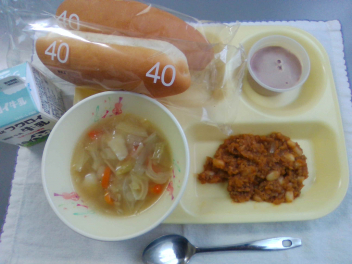 ロールパン 牛乳 チリコンカン 大麦のスープ ココアプリン でした。