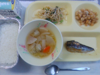 ごはん 牛乳 いわしの梅煮 ごまあえ 青のり団子汁 福豆 でした。