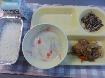 ごはん 牛乳 肉じゃが 煮干しのごまがらめ 豆乳入りみそ汁 でした。