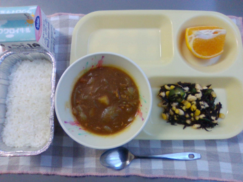 ごはん 牛乳 ポークカレー ひじきのサラダ いよかん でした。