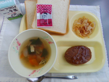 食パン 牛乳 チョコ大豆クリーム 煮込みハンバーグ ほうれんそうスープ はすチップス  でした。