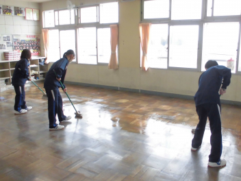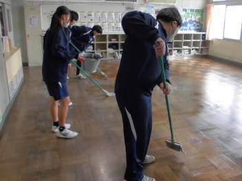 生徒たちの手によって、教室の床はしっとりと落ち着いた輝きを取り戻しています。