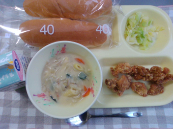 ロールパン 牛乳 鶏肉の米粉揚げ ボイルキャベツ チンゲンサイのクリーム煮 でした。