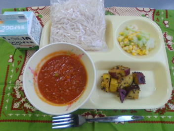ソフトめん 牛乳 ミートソース フレンチサラダ 大学いも でした。