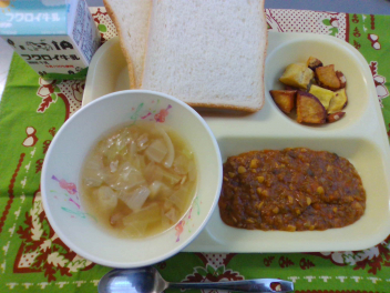 食パン 牛乳 キーマカレー アーモンドポテト 野菜スープ でした。