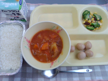 ごはん 牛乳 ハヤシ しょうゆ卵 いんげん豆のサラダ でした。