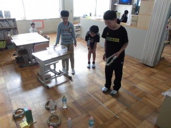 けん玉、輪投げ、どんぐりごま、めいろなど、なかよし1組の子が考えた楽しいゲームをみんなで楽しみました。