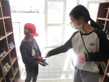 休み時間終わりに運動場から帰ってくる子に運動委員会の人が緑のTTYカードを配っています
