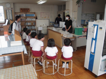 今日の昼休み、中ノ町幼稚園の園児が中ノ町小の図書室を体験しました。